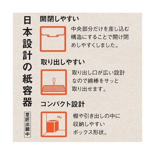 パッケージに紙容器を使用したSDGs商品です。中身は、広く使われているレギュラータイプの綿棒です。キトサン抗菌加工で、より衛生的に安心してお使いいただけます。 |
