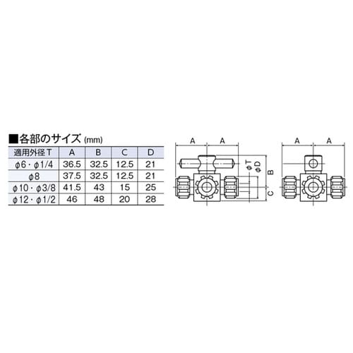 四方バルブ圧入型は、コック(芯棒)が圧入してある為、オリフィス径も大きくなっています。シールはソロバン型シールになります。 |
