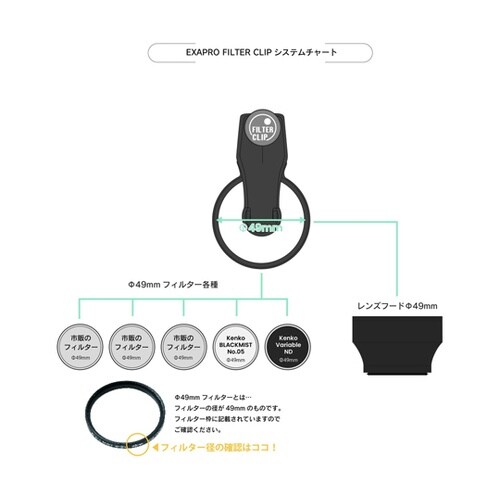 スマトーフォン用フィルター撮影システムEXAPRO フィルタークリップは、スマートフォンにクリップで装着し、使用したいフィルターをねじ込んで使用します。 |