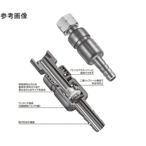 容器から吹管まで、溶断作業に伴う配管接続ができます。二重リップシール構造が接続時の漏れを防止。また、誤接続防止のため、酸素用と燃料ガス用でかん合サイズが異なります。 |