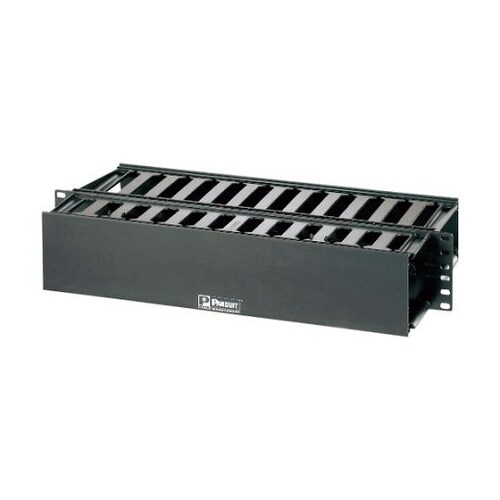19インチラックに取付可能です。ヒンジ式のカバーは上下開閉、脱着可能です。パッチコード貫通穴はワイドで使用しやすいです。 |