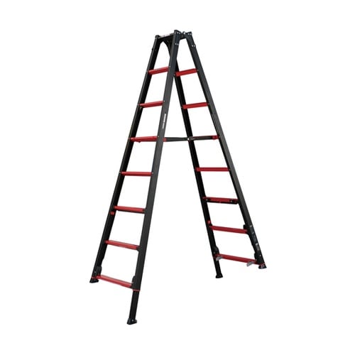 上部操作式伸縮脚付専用脚立伸縮脚435mmの調整を立ったままできるという進化とステップ幅60mmによる安心感を併せ持った新型脚立。 |