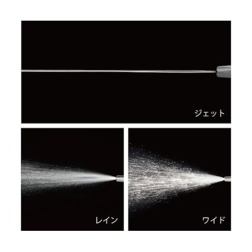 洗車や清掃、水やりなどに適した3つの水形で、勢い重視から範囲重視など、様々なシチュエーションに対応します。手元のダイヤルを回すだけで、水量の調整が可能です。 |