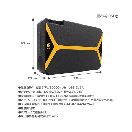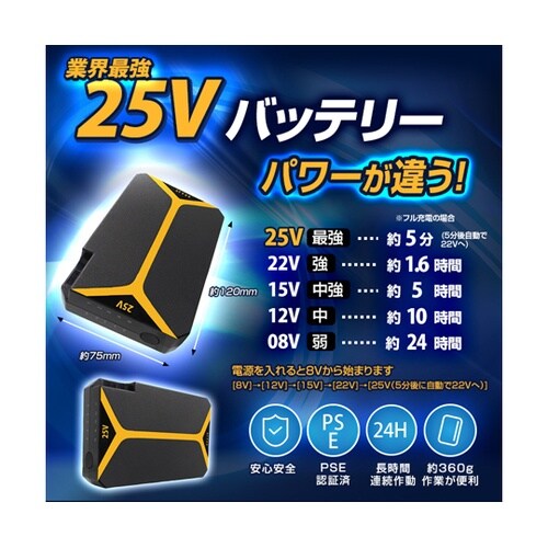 25Vバッテリーの単品販売。胸スイッチには対応しておりませんので、接続しないでください。バッテリーのボタンを操作して使うタイプです。 |