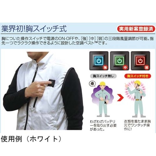 胸スイッチで操作が可能になります。フルハーネス着用にも対応。フルハーネスを着用した上から着られます。ウェアに取付けたファンがウェア内へ送風。腕部分や裾は、ゴムで風を逃がしません。 |