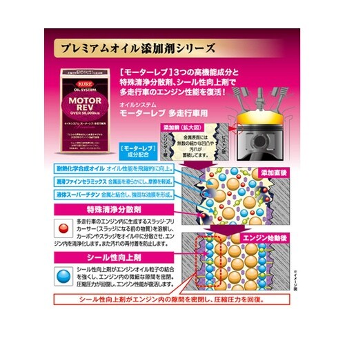 モーターレブに2つの新成分をプラス。すべての多走行車のエンジン性能を復活させるプレミアムオイル添加剤モーターレブの3つの高機能成分はそのままに、「特殊清浄分散剤」「シール性向上剤」を配合。 |