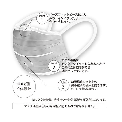 オメガ型立体設計・8mm耳掛けヒモ・使い捨てタイプ樹脂素材のノーズフィットピースにより鼻のラインにぴったり合わせられます。1枚から持ち運び可能な個包装タイプです。 |