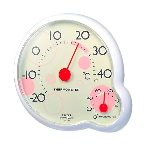 直径120mm程度の温湿度計です。背面に壁掛け用の穴があります。卓上で自立します。快適温度・湿度を文字盤の色でわかりやすく表示します。 |