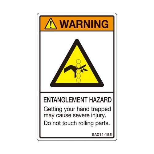 ISO規格に準拠した縦型の警告ラベルです。英文表記です。 |