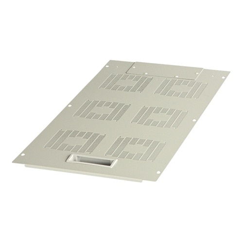 RNCシリーズのラック本体枠用の天板です。非磁性で軽量のアルミニウム製です。ファンモーター(120mm角の機種)が4個または6個取り付けできます。ケーブル入線用穴(カバー付)を設けています。 |