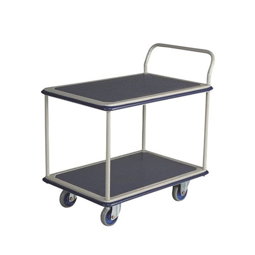 デッキの全周には衝撃吸収ゴムバンパー付。床に黒いゴム跡がつきにくいノーマーキンググレーキャスター採用。ピッキング作業等に便利な2段仕様で積載面が2倍、腰をかがめる作業やピッキング作業の疲労軽減に。 |