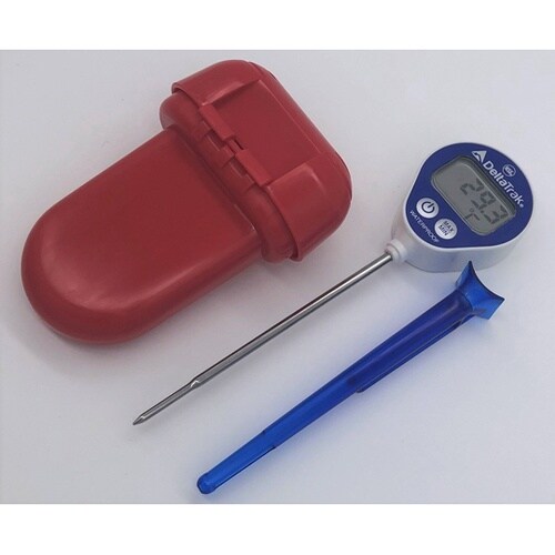 業務用食器洗浄機でのすすぎ段階の温度測定が可能です。温度計本体をカバーに入れた状態で測定環境に設置し、ケースから露出しているプローブによって計測します。最高/最低温度のメモリー機能を搭載しています。 |