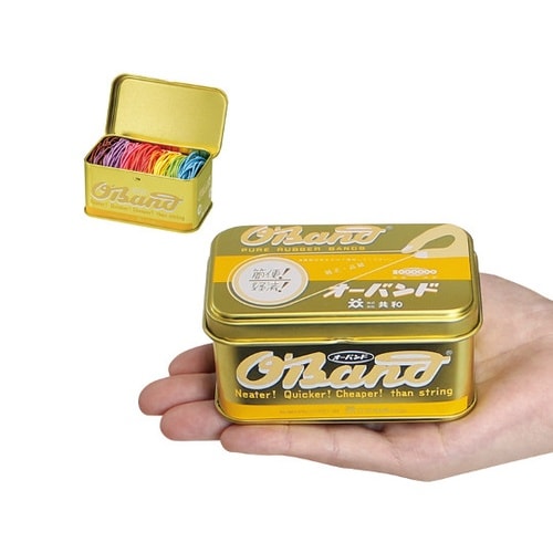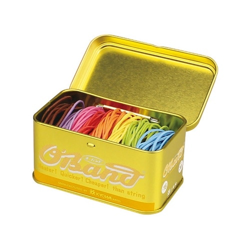 輪ゴムの「オーバンド」がゴージャスなゴールドのブリキ缶に。手のひらサイズでレトロかわいい。中には8色の輪ゴムが贅沢に入っています。 |