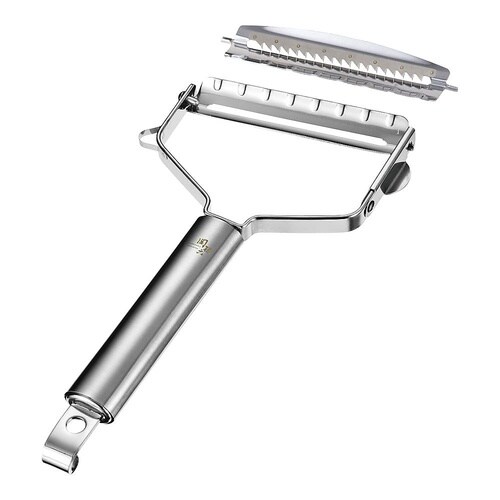 キャベツの千切りや大根のかつらむきなどに便利なワイドタイプです。切り離れしやすい刃形状と、芽が取りやすいU字形状の芽取りが特徴です。収納時に安全な刃カバー付きです。 |