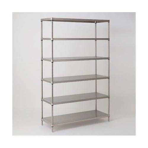 SUS304(18−8)ステンレス棚。段差の無いフラット棚。耐錆、耐食性に優れ、病院、半導体工場に最適。耐荷重180kg。 |