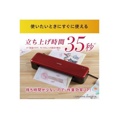 75μmフィルムに対応。より薄いフィルムで加工できるので、使用用途の幅が広がります。ウォームアップ時間約35秒、究極のスピードと仕上がりを追求した高速起動ラミネーターです。 |