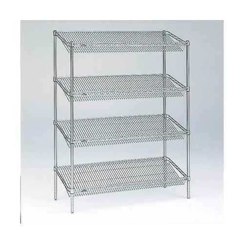物品の出し入れが容易で、視認性に優れる傾斜棚(傾斜角30°、深さ100mm)。ディスプレイ用什器にも適します。ポールはSUS304(18−8)ステンレス製。 |