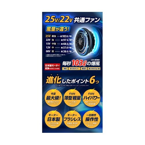 お手持ちの空調ウェアが簡単に25Vにパワーアップ!これを買って付けるだけ!業界超強ファンユニット 25V対応 日本メーカーのモーター NIDEC(日本電産)を使用。 |