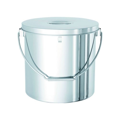 かぶせ蓋付きのステンレス容器。「投入ブラケット」と「下部取っ手」が中身を投入する動作をサポートします。ツル(吊り下げ用の取っ手)と下部の取っ手を掴み、容器を楽に傾けられます。 |