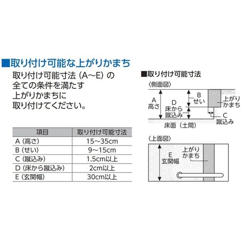 コンパクト▼30cmあれば設置可能。▼間口の狭い玄関にもぴったり。シンプル▼工事不要。▼上がりかまちを挟みこむだけ。▼式台不要でシンプル設置。 |
