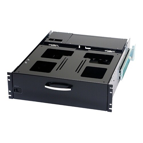 19インチラックに、液晶モニターと、フルサイズのキーボードと、マウスが収納できます。高さが3Uに、すっきりとまとまりました。 |