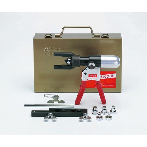 ダイスの交換のみで、45°フレア、スウェイジングが可能です。油圧式なので軽いハンドル操作でスムーズに加工。つば出し用ゲージ、ローラーの追加によりフレキシブルチューブのつば出しにも対応。 |