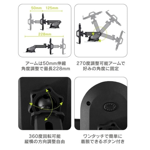 ホルダーサイズ:約113×67×108mm | ホルダー開口幅:約50〜100mm | アーム調整角度:約270度 | アーム伸縮幅:約50mm | …