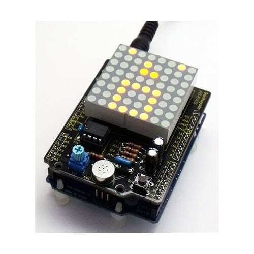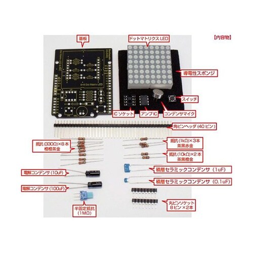 【製品説明】ドットマトリクスLED(8×8)とマイク入力を使ったArduino(アルドゥイーノ)用オプション基板(シールド)を作成できるキットです。 |