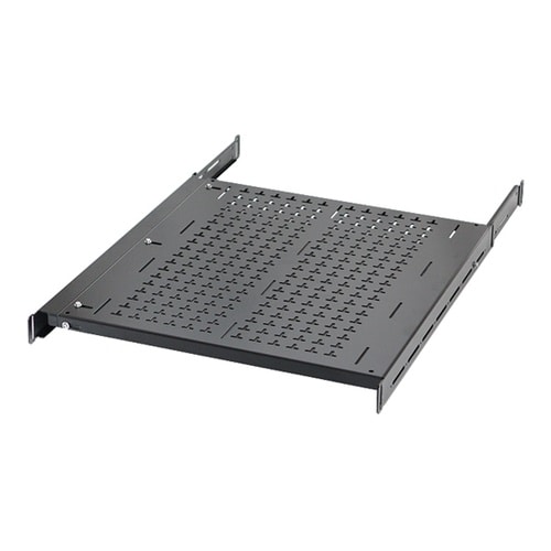 幅と奥行長さが調整可能な収納棚です。棚を伸縮させ、19インチラックの幅方向、奥行方向に合わせて調整できるので、さまざまなラックに取付可能です。T字形の穴があいているため、放熱効果があります。 |