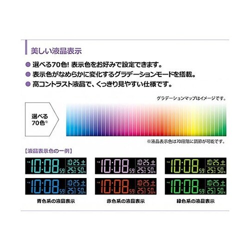 今、注目の「色」を楽しむカラフルな文字表示。抜群の視認性で、スタイリッシュに表示します。交流式でLED表示の電波時計、カレンダー・温度・湿度表示機能付。LED色を70色から選べることができます。 |