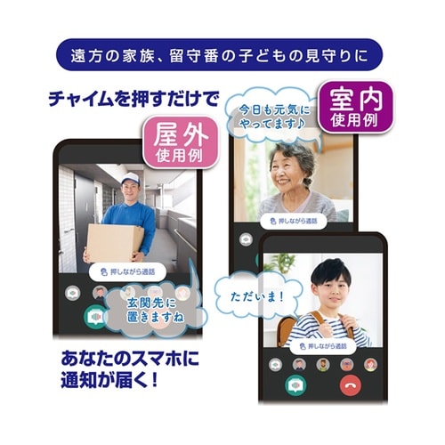 ボタンで呼出、外出先からスマホで応答、画像記録可能な呼び出しホン。※記録画像はアプリ内に20日間保存。電池内蔵でワイヤレスで使えます。待ち受け最大4ヶ月充電不要。※1日3回の呼出で20秒の通話の場合。 |