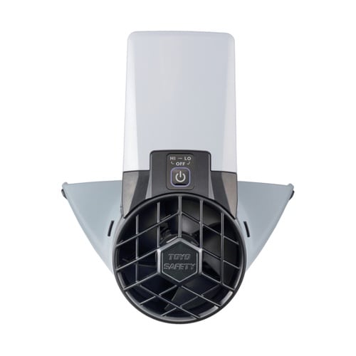 ヘルメット取付式の送風機です。電源は単3形電池3本使用。(別売り)風量調節は「HI(強)」,「LO(弱)」の2段階切り替え式。 |