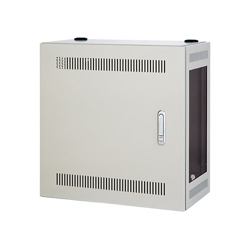 サイドドアは開閉方向を変えることができます。サイドドアには内部の温度上昇を抑えるために上下に放熱穴を設けています。フロントドアはラック内部が見えるアクリル窓仕様です。 |