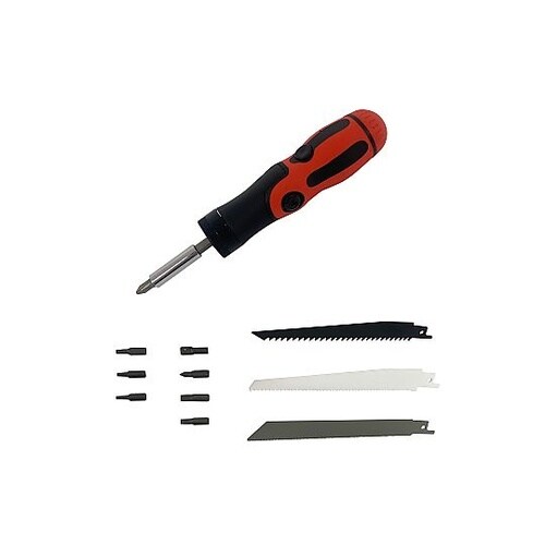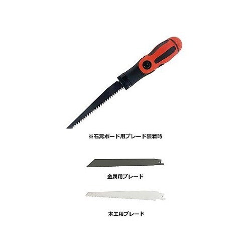 市販のセーバーソーブレードを取り付けられるハンドルです。付属のビットを取り付ければドライバーにもなります。ストッパーを押せばハンドルの曲げ伸ばしができます。 |