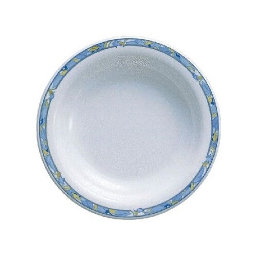 定番サイズのシンプルなフォルムのスープ皿。帯状にアレンジされたブルーの花が小粋な印象です。リムがあって持ちやすく、スタッキング性抜群です。 |