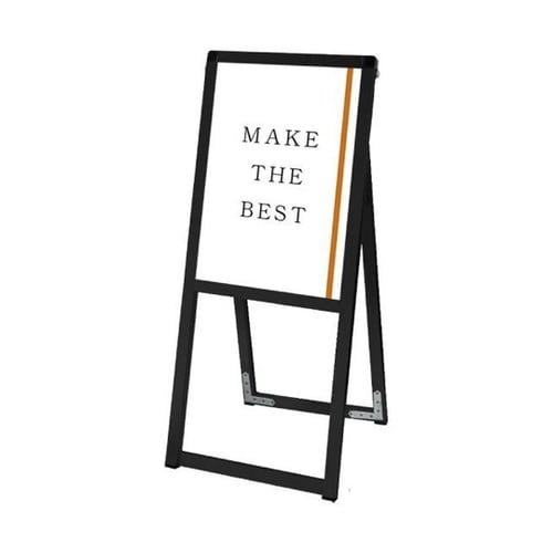 スマートでシンプルなデザインを追求した薄型スタンド看板。ポスターの交換は、本体上部の左右にあるビスを取り外し、上辺のフレームを引き抜いて面板とアクリルカバーの間にポスターをセットするだけです。 |