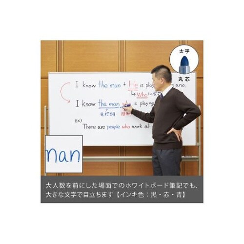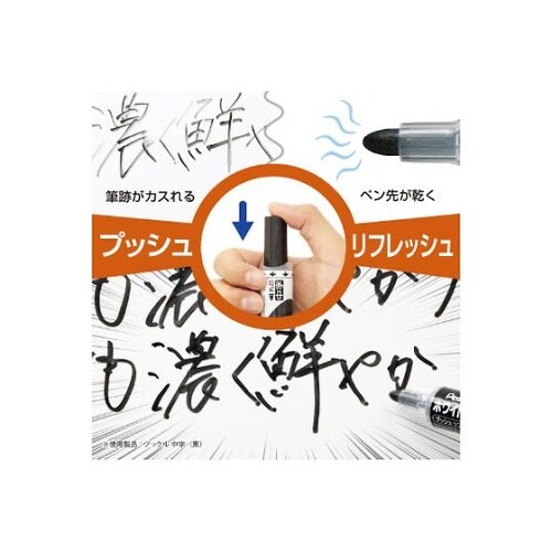 大きな会議室や教室などでおすすめ!インクが薄くなったらすぐプッシュ!最後までみずみずしい鮮やかな筆記の直液式。インク残量が見える表示窓付き。 |