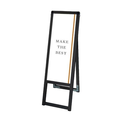 スマートでシンプルなデザインを追求した薄型スタンド看板。ポスターの交換は、本体上部の左右にあるビスを取り外し、上辺のフレームを引き抜いて面板とアクリルカバーの間にポスターをセットするだけです。 |
