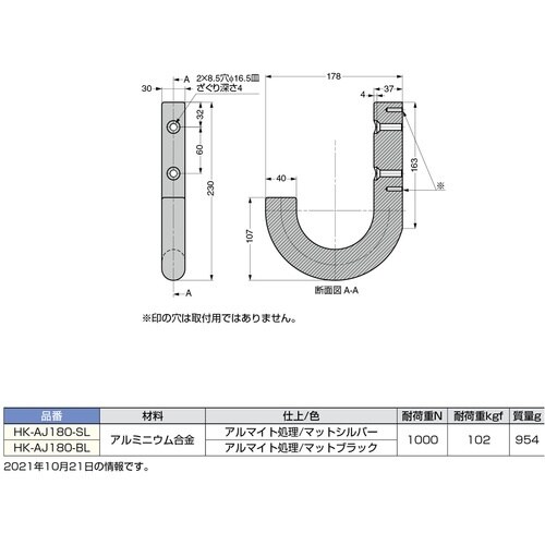 奥行き約180mmの大きなフックです。肉厚なアルミ材を厚手方向にきれいに曲げています。滑らかで触り心地の良い質感です。 |