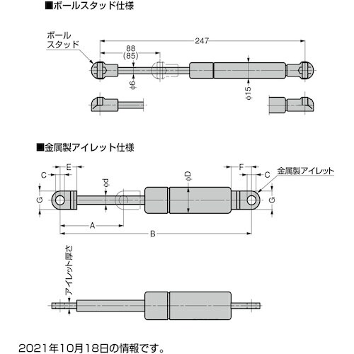 | 注意事項 | ※ご使用の際は、ピストンロッドが下向きになるよう取り付けてください。−30℃ー80℃の範囲内でご使用ください。最大圧縮となる位置で、ピストンロッドに5mm以上の押込み余裕を残すように取り付けてください。ガススプリングを自由長さ以上に伸ばさないでください。絶対に分解しないでください。高圧の窒素ガスが封入されているため危険です。 |