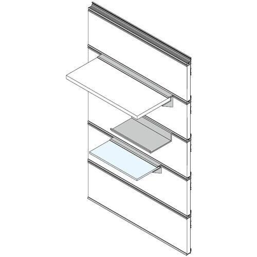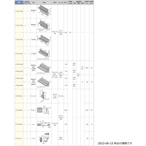 対応部品に新しく、平プレート、トレイ、フックが加わりました。平プレートはお客様で必要な長さにカットしてご使用ください。使用例はVT−J2000をご覧ください。高耐荷重タイプの調整付棚受システムです。 |