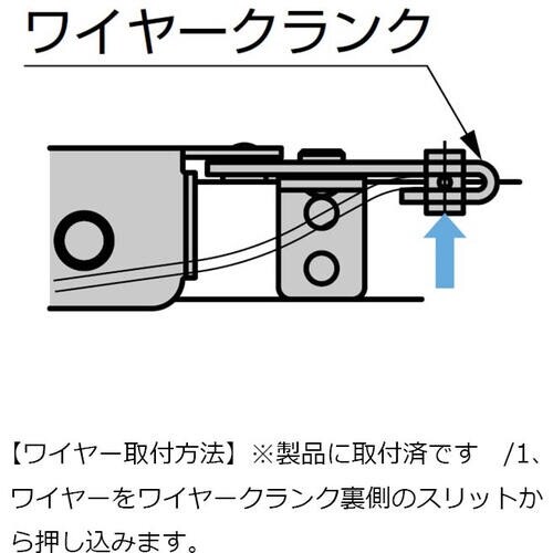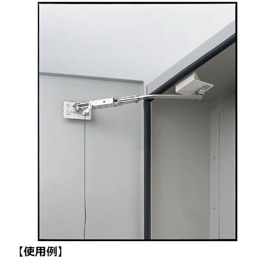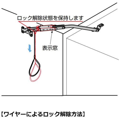 扉を全開にすると自動的にロックするあおり止めステーです。ロック解除を保持する機能が付いています。ロック解除を保持している時は表示窓が赤色になります。手元でロックの解除ができるワイヤー付きです。 |