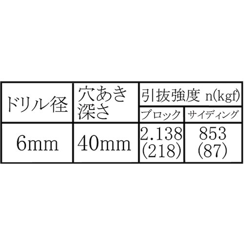 ※ALC、石膏ボードなどの柔らかい材質のものに対しては使用できません。施工の際は安全眼鏡などの保護具を必ず使用してください。設計強度は一般に1/5以下に設定されています。