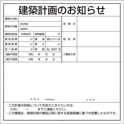 表示内容:建築計画のお知らせ(大阪市型) | 取付仕様:ビス止め | 縦(mm):900 | 横(mm):900 | 厚さ(mm):3 | タイプ:大…