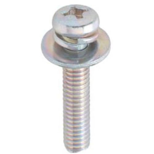 十字穴付なべ小ねじにばね座金と平座金が組込まれており、脱落しません。組込み式なので作業効率が向上します。材質は鋼で耐食性向上のため、三価クロメートめっき(薄青っぽい色)がしてあります。 |