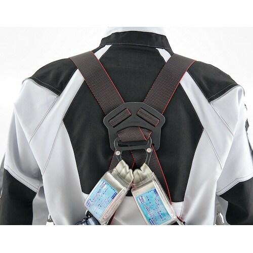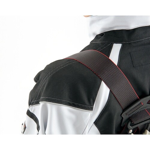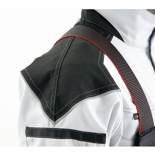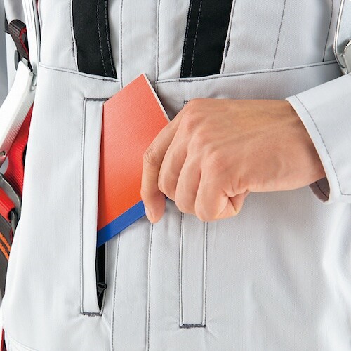 ハーネス着用時でも多くのポケットを活用でき収納力に優れています。ストレッチ生地使用と3D立体カッティングで、腕・肩部分が動かしやすい作業着です。ハーネスが触れる部分には摩耗耐久素材を使用しています。 |