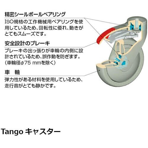 滑らかな回転と耐久性をかね備え、走行音も静かです。シンプルな形状で、手入れが簡単です。床面などにキャスターの車輪跡を残しません。1つのブレーキ操作により、車輪ブレーキと旋回ロックが同時にかかります。 |