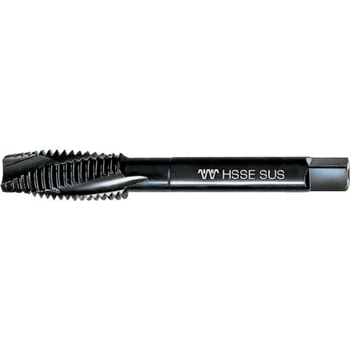 特殊二番加工で摩擦トルクを低減します。全体溝が左螺旋状溝となっているので、切粉が進行前方へ残らず排出されます。溝が浅く、タップの心厚が大きいので、ねじれ強度が強く折れにくいです。 |