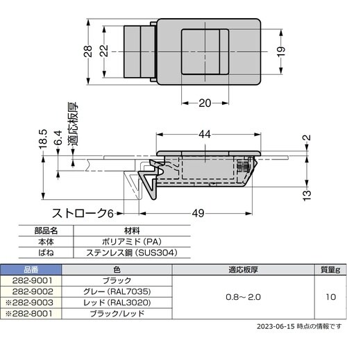 扉や蓋の取付穴に差し込むだけで、ワンタッチで取り付けできます。扉を閉めるとラッチが自動的に掛かります。ポリアミド製で錆の心配がありません。内蔵ばねはステンレス鋼(SUS304)製です。 |