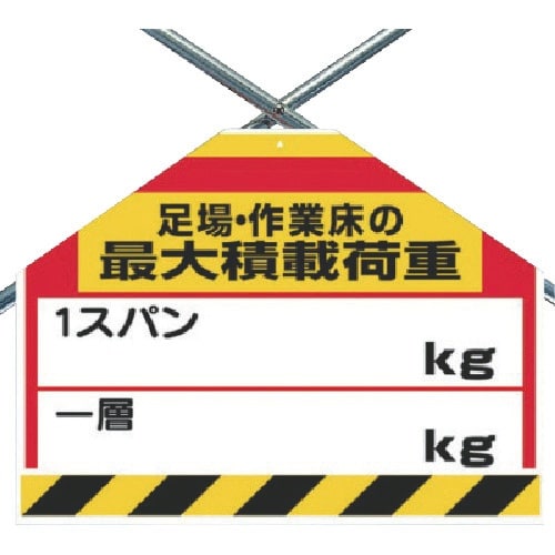 表示内容:足場・作業床の最大積載荷重1スパン○kg・一層○kg | 取付仕様:裏面マジックテープ式 | 縦(mm):450 | 横(mm):600 |…